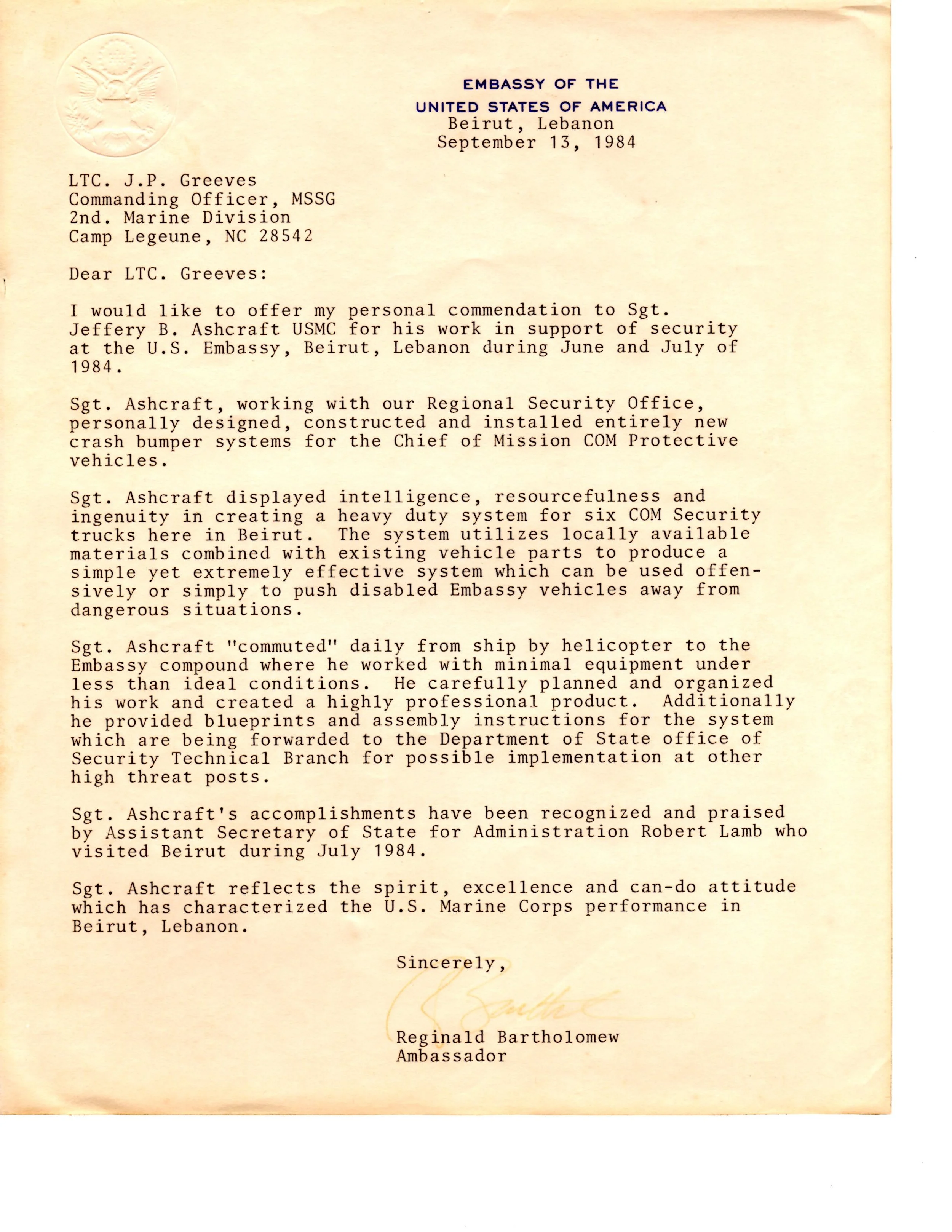 Receiving a personal commendation from Reginald Bartholomew, US Ambassador Lebanon was an unexpected pleasure for sure.